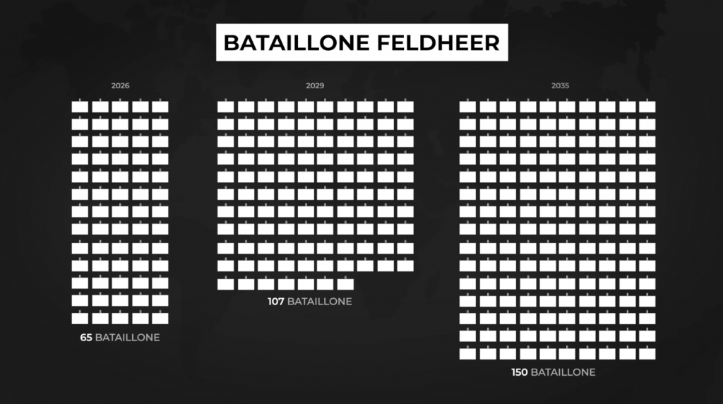 Dieser geplante Aufwuchs spiegelt sich auch auf Bataillonsebene wider. Laut dem Magazin .loyal soll das Heer von derzeit etwa 65 auf 107 Bataillone bis 2029 und schließlich auf 150 Bataillone bis 2035 anwachsen. Das entspricht einem Aufwuchs von 85 Bataillonen innerhalb eines Jahrzehnts.