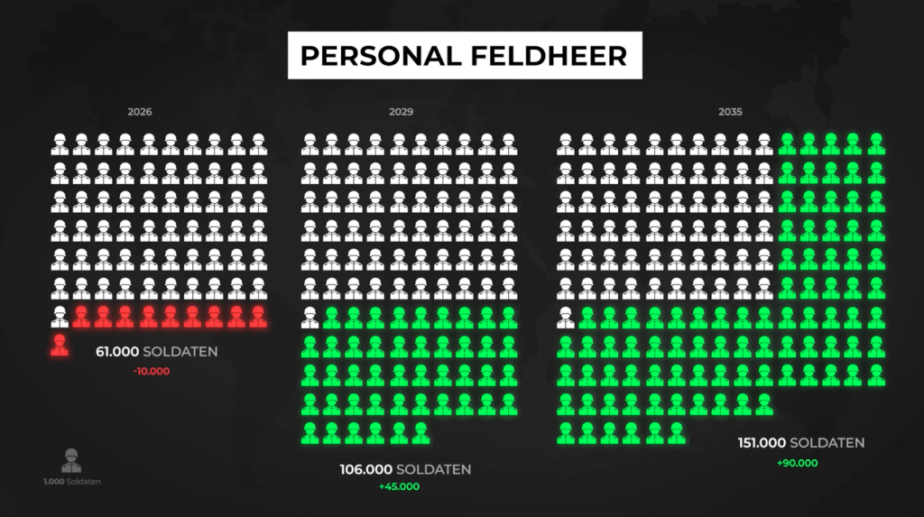 Zusammengefasst benötigt das Heer zusätzlich 99.500 aktive und 192.500 nicht aktive militärische Dienstposten, um den als erforderlich erachteten Gesamtumfang von 161.000 aktiven Soldatinnen und Soldaten sowie 236.000 Reservistinnen und Reservisten zu erreichen.