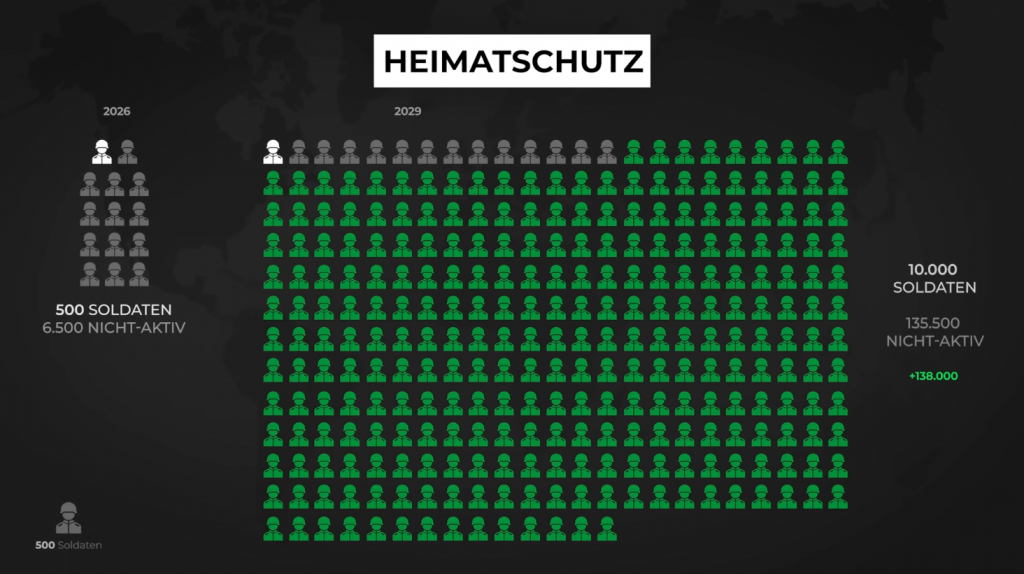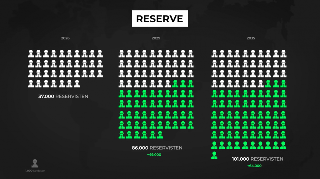 Ähnlich ambitioniert ist der Aufwuchsplan für die Reserve des Heeres. Von aktuell rund 37.000 Reservistinnen und Reservisten soll die Heeresreserve bereits bis 2029 um 49.000 auf insgesamt 86.000 nicht aktive militärische Dienstposten anwachsen. Bis 2035 ist ein weiterer Aufwuchs um zusätzliche 15.000 Reservistinnen und Reservisten auf insgesamt 101.000 nicht aktive militärische Dienstposten geplant. Insgesamt soll das Heer somit um 64.000 Reservistinnen und Reservisten von aktuell rund 37.000 auf 101.000 anwachsen. Dieser Aufwuchs ist erforderlich, um die Truppenreserve und den Feldersatz zu stärken und die geforderte Verteidigungsfähigkeit zu erreichen.