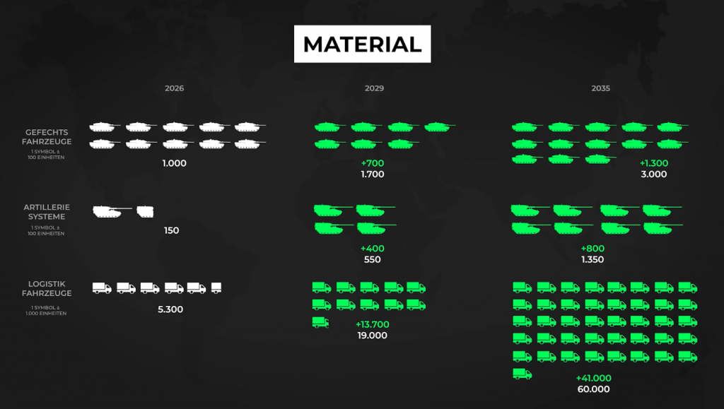 Der Bestand an Gefechtsfahrzeugen soll von aktuell rund 1.000 Fahrzeugen bereits bis 2029 um 700 Stück auf 1.700 Systeme steigen. Bis 2035 ist ein weiterer Aufwuchs um 1.300 Fahrzeuge auf insgesamt 3.000 Gefechtsfahrzeuge geplant. Insgesamt sollen in den nächsten zehn Jahren also rund 2.000 zusätzliche Gefechtsfahrzeuge zulaufen. Dabei handelt es sich um Kampfpanzer Leopard 2, Schützenpanzer Puma und Schakal sowie Schwere Waffenträger Infanterie. Bekannt ist, dass die Beschaffung von rund 1.000 zusätzlichen Leopard 2, mindestens 600 Schützenpanzern Puma sowie 150 bis 350 Schützenpanzern Schakal geplant ist.